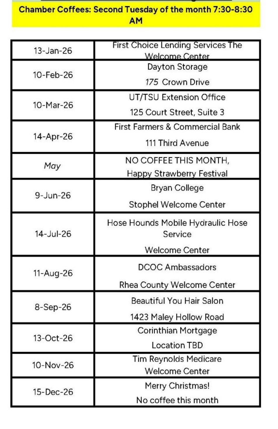 Second Tuesday of each month, Dayton Chamber Coffee The Schedule is subject to change; check the website calendar to verify the location.