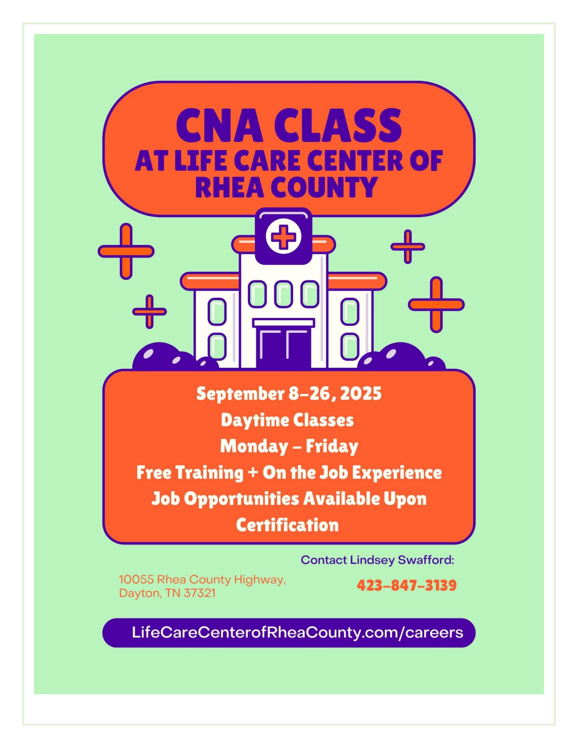 10055 Rhea County Hwy 10055 Rhea County Hwy, Dayton, TennesseeSeptember 8-26; Daytime Classes Monday -Friday Free Training and On-the-Job Experience Job Opportunities Available Upon Certification Contact Lindsay Swafford for more information: 423-847-3139