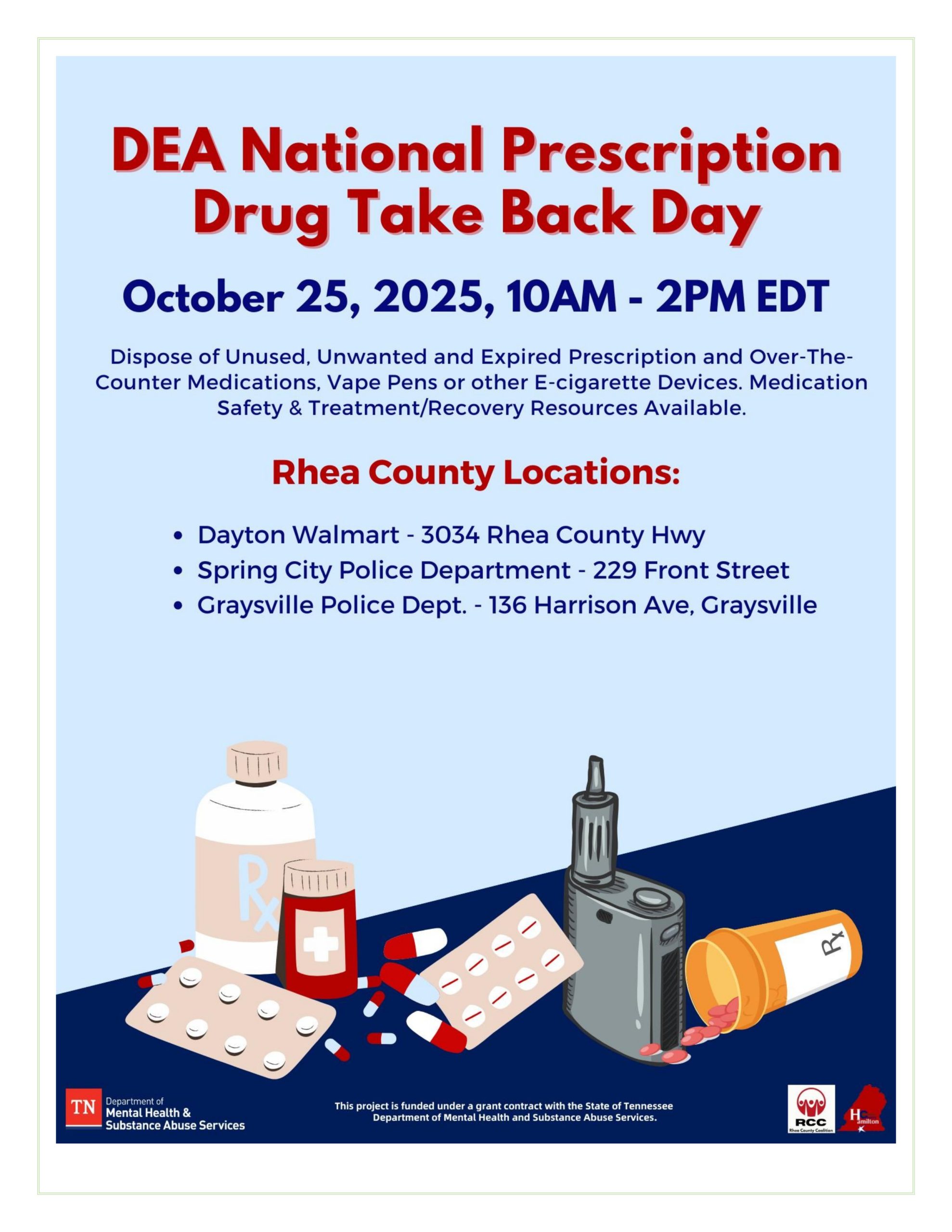 Dispose of Unused, Unwanted, and Expired Prescriptions and Over-the-Counter Medications, Vape Pens, or other E-cigarette Devices. Medication Safety & Treatment/Recovery Resources are Available. Rhea County Locations: Dayton Walmart - 3034 […]