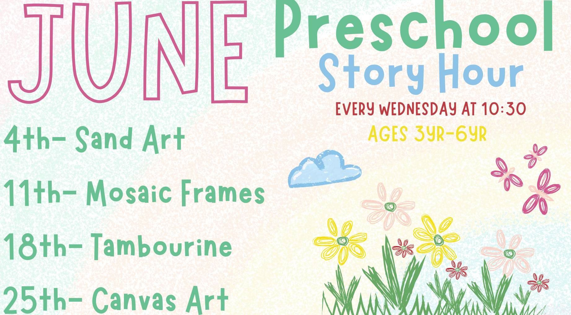 Every Wednesday at 10:30 am for ages 3 yr - 6 yr June 4th - Sand Art June 11th - Mosaic Frames June 18th - Tambourine June 25th - […] |