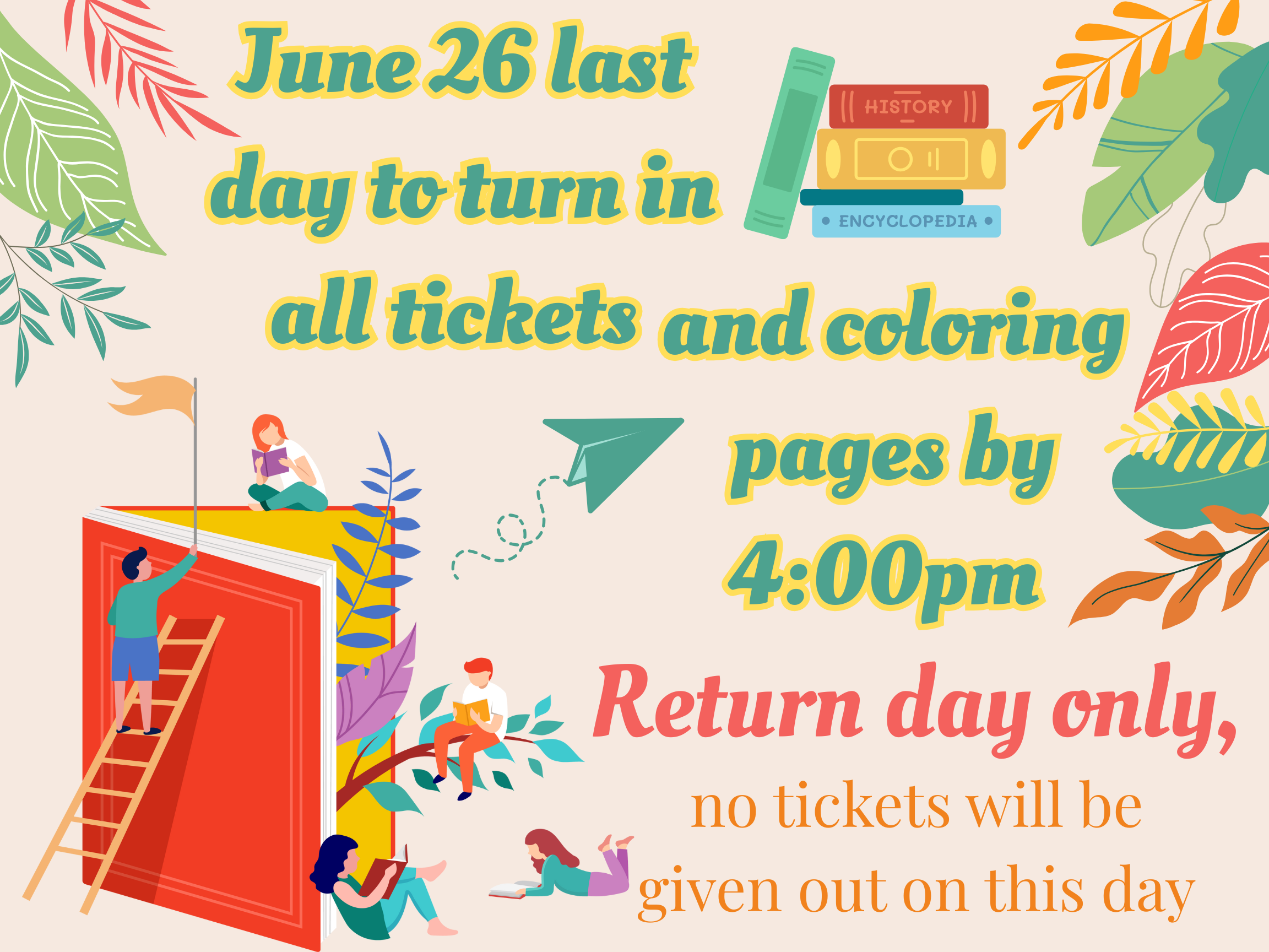 Last day to turn in all tickets and coloring pages by 4:00 pm Return day only, no tickets will be given out on this day